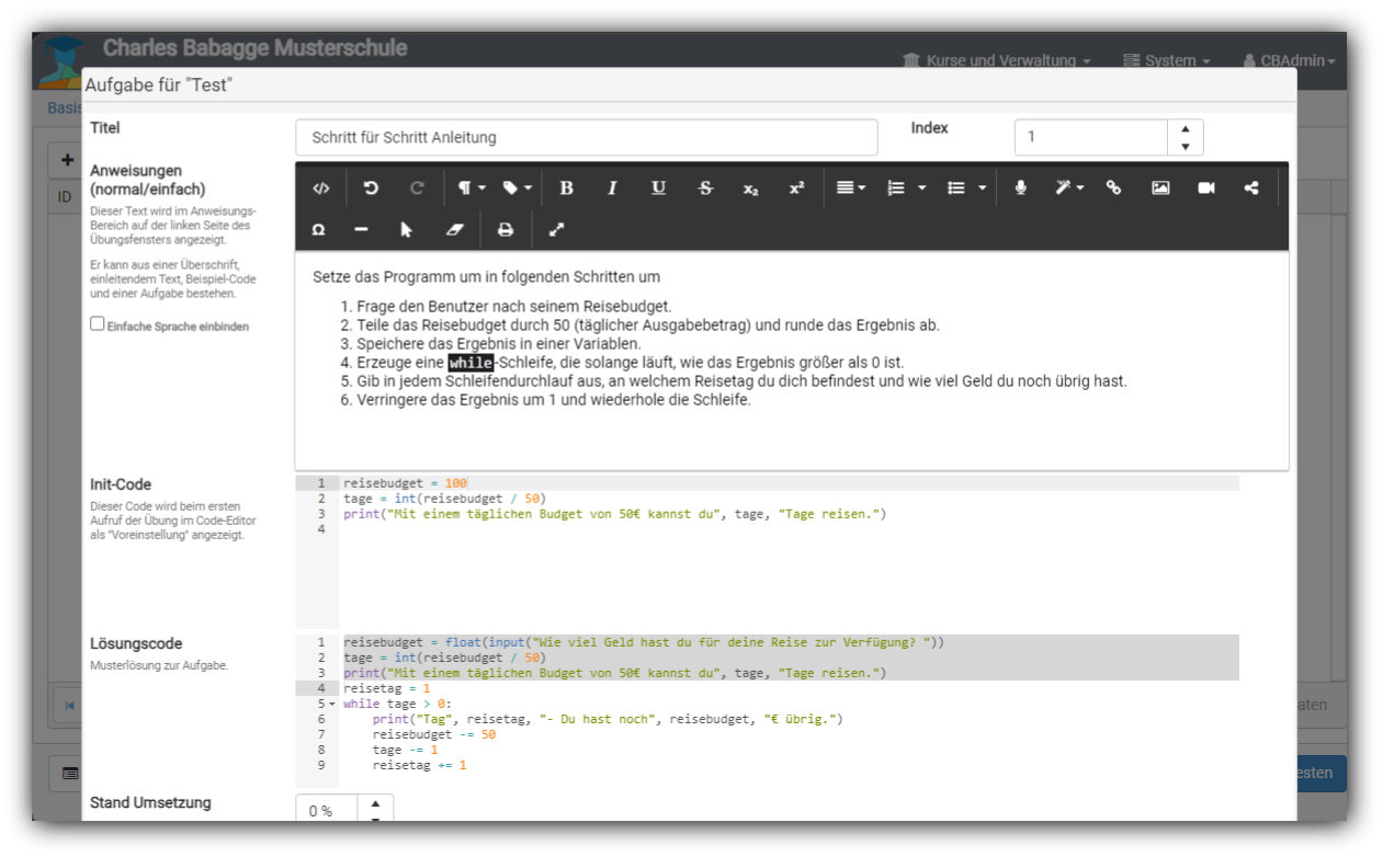 Pro Anleitung können ein oder mehrere Übungsaufgaben hinterlegt werden, welche aus einem Titel, einer Anweisung sowie ggf. einem Initialcode bestehen.